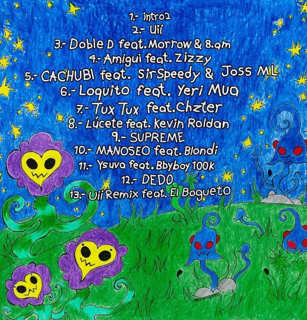 Entre los cortes se incluyen “intro”, “Uii”, “Doble D” (con Morrow & 8.am), “Amigui” (con Zizzy), “CACHUBI” (con Sir Speedy & Joss ML), “Loquito” (con Yeri Mua), “Tux Tux” (con Chzter), “Lúcete” (con Kevin Roldán), “SUPREME”, “MANOSEO” (con Blondi), entre otros.